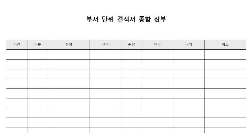 각 부서에서 제출한 견적서 정보를 하나로 모아 체계적으로 정리하고 전사적 관점에서 예산을 분석하는 문서로 작성 기간과 회계연도를 명확히 기록하고 품명 분류로 구매 물품의 세부 특성을 파악하며 수량 관리를 통해 발주 기준을 마련하고 단가 산정으로 예산 수립의 근거를 제시하며 총액 계산으로 전체 비용 규모를 확인하여 경영진의 의사결정을 지원하는 부서별 견적 통합 관리대장입니다.